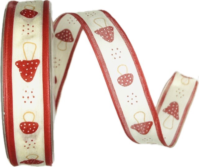 Okouzlující látková stuha Amanita s veselým potiskem červených muchomůrek vnese do vašich dekorací pohádkovou atmosféru lesa. Jemná bavlněná tkanina je lehce průsvitná, díky čemuž působí oboustranným dojmem, a drátkované okraje zajistí, že mašle i ozdoby budou krásně držet svůj tvar.