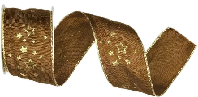 Elegantní látková stuha v čokoládově hnědé barvě s jemným zlatým potiskem hvězd přináší sofistikovaný vzhled každé sváteční dekoraci. Oboulící provedení s jemným saténovým leskem působí luxusně, zatímco tenký drátek v okrajích umožňuje snadné formování mašlí bez sklouzávání tvaru.