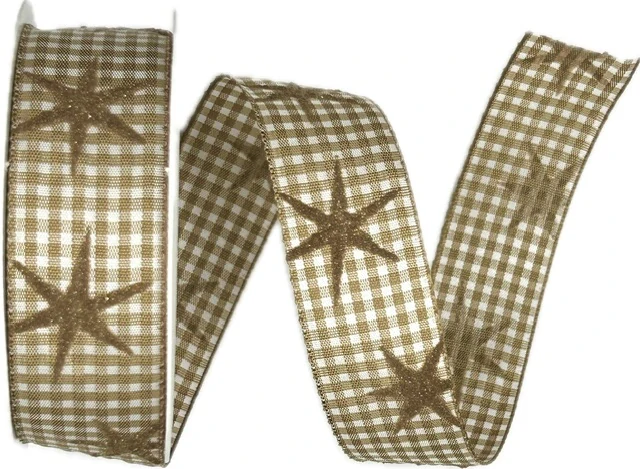 Krásná vánoční stuha v jemné skořicově bílé kostce s potiskem třpytivých hvězd. Nepravidelné hvězdy dodávají dekoraci osobitý kouzelný vzhled, aniž by působily příliš výrazně – ideální pro ty, kdo hledají přirozeně laděnou slavnostní výzdobu.