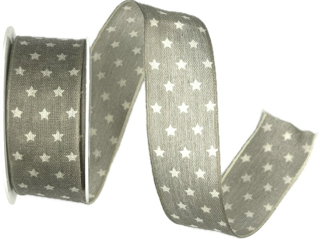 Elegantní vánoční stuha v matně stříbrném odstínu s výrazným černým potiskem hvězd.