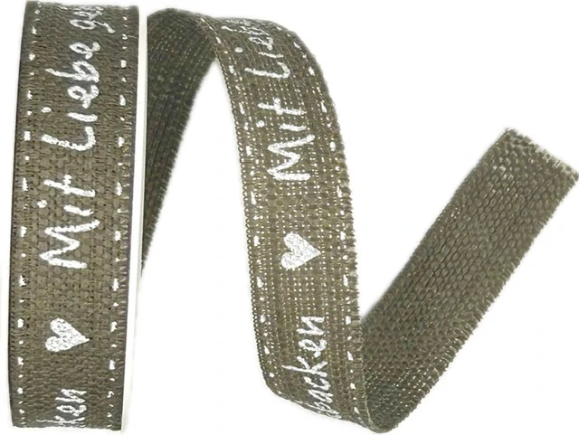 Přírodní tkaná stuha s bílým trendy potiskem Mit Liebe gebacken. Máte německého kolegu, šéfa, obchodního partnera nebo mají děti veškole prima němčinářku a ráda pečete? Když krabičku s Vámi upečenou dobrotou pro ně dozdobíte touhle stuhou, potěšíte o to víc!