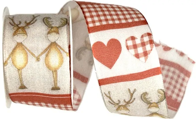 Kvalitní bavlněná stuha v jemně přírodním tónu s jednostranným fotopotiskem sobího páru držícího se za ruce, doplněného o srdíčka, kostkované detaily a folklórní motivy. Vytváří útulnou, rustikální a zároveň veselou atmosféru – ideální pro zimní a vánoční dekorace.