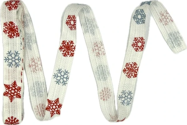 Krásná přírodní bavlněná stuha v bílé barvě se zimním motivem sněhových vloček v červené a šedé barvě. Jemný jednostranný potisk působí hravě a svátečně, ideální pro tradiční i moderní vánoční dekorace.