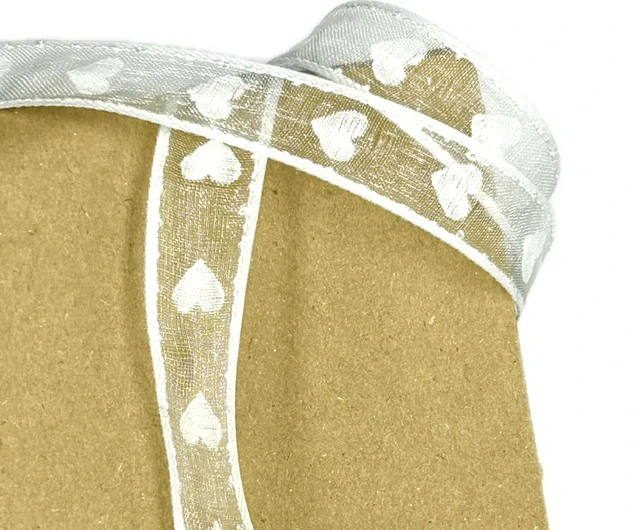 Stuha je zdobená oboustranným potiskem bílých srdcí, který vytváří decentní, romantický efekt bez rušivého kontrastu. Obšité okraje zajišťují pevnost, čistý vzhled a snadnou manipulaci při vázání.