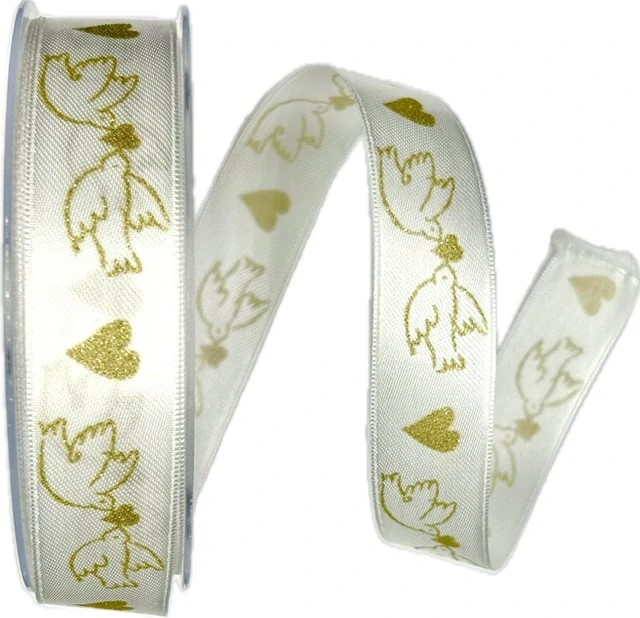 Elegantní saténová stuha v bílé barvě s jemným leskem a výrazným zlatým potiskem holubic a srdíček s glitrovým efektem působí slavnostně a romanticky. Symbol holubic vyjadřuje lásku, mír a věrnost – ideální volba pro svatební dekorace.