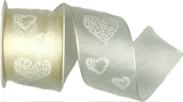 Elegantní organzová stuha DREAM v jemném krémovém odstínu s plastickým potiskem bílých srdcí působí velmi luxusně, něžně a slavnostně. Kombinace tón v tónu vytváří sofistikovaný efekt, který je ideální pro svatební dekorace i romantické aranžmá.
