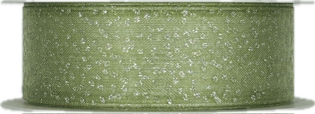 Stuha organzová, pastelově zelená, transparentní s jemným perleťovým potiskem a glitrovým efektem. Má zesílené kraje pro lepší držení požadovaného tvaru, v obou okrajíc vetkán tenký silonový vlasec, nahrazující dříve používaný drátek. Má tak tvarově stálé hrany a nekroutí se. Efekt je velice podobný, se stuhou se snadněji pracuje a netupí nůžky. Je vhodná na samostatné vázání nebo pro kombinaci se stuhami širšími.