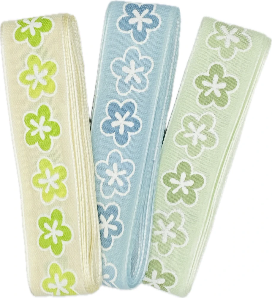 Tkaná dekorativní stuha v přírodním krémovém odstínu s veselým potiskem květin v pastelově zelené až...
