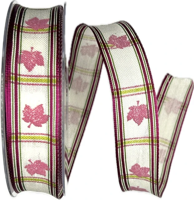 Dekorační látková stuha Autumn Leaves Line v šíři 25 mm s jemným potiskem růžových listů na světlém podkladu je ideální volbou pro podzimní aranžmá i celoroční tvoření. Jednostranný potisk doplňuje drátkování v obou okrajích, díky němuž si mašle krásně drží svůj tvar a snadno se s ní pracuje.