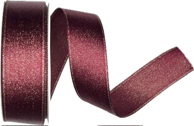 Luxusní saténová stuha v hlubokém bordó odstínu s jemným zlatavým leskem, který vytváří elegantní perleťový efekt díky příměsi lurexu. Oboulící provedení a pevně tkané okraje zajišťují perfektní vzhled mašlí i dekorací bez ohýbání či třepení.