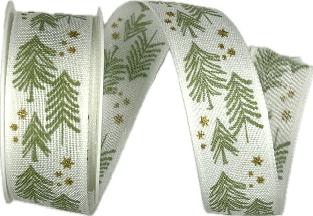 Krásná vánoční stuha v bílé barvě s jemným jednostranným potiskem stylizovaných zelených stromečků a drobných zlatých hvězdiček. Vyrobena z kvalitní bavlny, se zpevněnými okraji díky vetkanému silonovému vlasci – díky tomu si mašle skvěle drží tvar a stuha se nekroutí. Ideální pro přírodní a minimalistické balení dárků nebo rustikální dekorace.