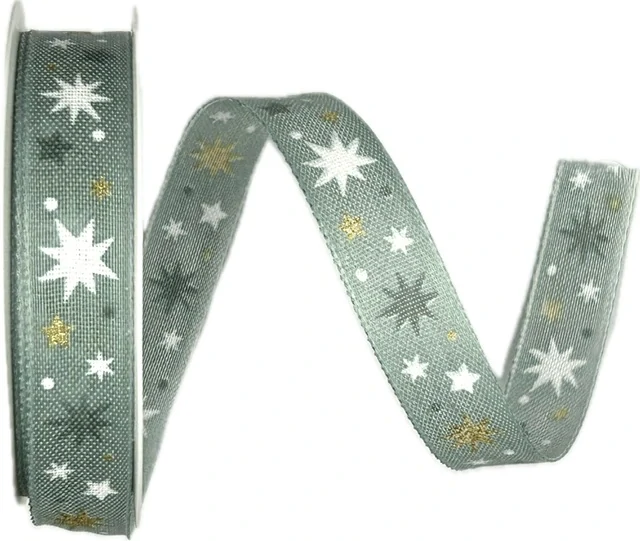 Krásná bavlněná stuha o šíři 15 mm a délce 4 m s jednostranným potiskem bílých a zlatých hvězd na šedozeleném podkladu. Jemná kombinace působí elegantně a přitom hravě – ideální volba pro vánoční i zimní dekorace s přírodním nádechem.