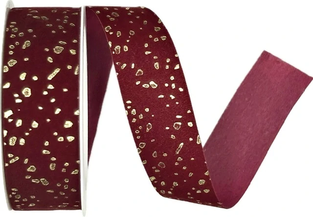 Luxusní sametová stuha v sytě bordó odstínu, zdobená zlatým třpytivým potiskem připomínajícím zlatý prach. Vhodná pro slavnostní balení dárků i vánoční dekorace, působí noblesně a zároveň moderně.