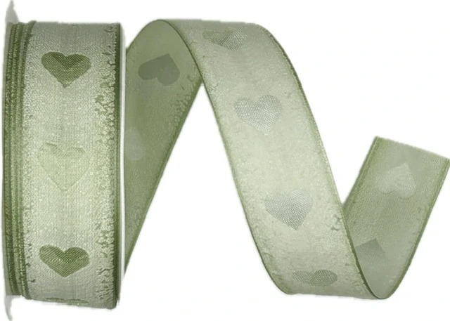 Jemná taftová stuha GREEN PASSION v pastelově zeleném odstínu přináší do dekorací svěžest, lehkost a přírodní eleganci. Inverzní potisk průsvitných srdcí vytváří decentní tón v tónu efekt, který působí velmi jemně a zároveň dodává stuze hloubku a zajímavý vizuální detail.