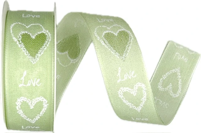 LOVE PASTEL GREEN je jemná pastelově zelená taftová stuha s jednostranným potiskem bílých srdíček a nápisů „Love“. Vyrobena z kvalitní látky se zpevněnými okraji a vetkaným tenkým silonovým vlascem – skvěle drží tvar, nekroutí se a působí pevným dojmem.