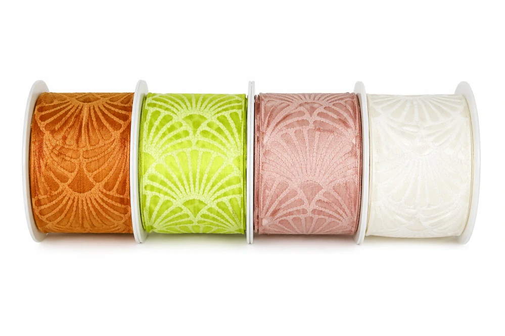 Svěží taftová stuha v jarně zeleném odstínu s bohatým tkaným vzorem připomínajícím vějíře nebo stylizované květy. Lesklý efekt vzoru dodává eleganci, zatímco výrazná barva přináší hravost a energii.