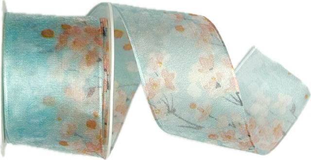 Vzdušná taftová stuha v jemně modrozeleném odstínu, s potiskem rozkvetlých větviček v tlumených růžových a béžových tónech. Květiny působí, jako by se vznášely v jarním oparu, a dodávají stuze zasněný a uklidňující vzhled.