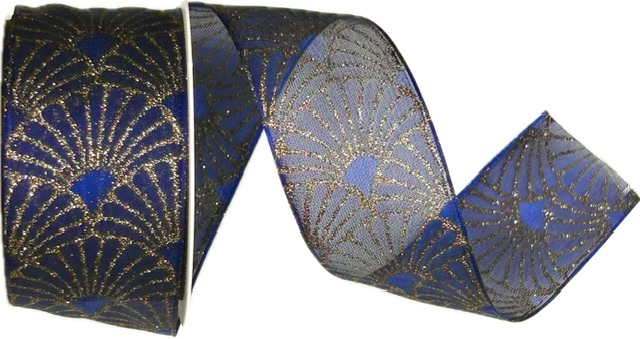 Luxusní organzová stuha v sytě tmavě modrém odstínu s elegantním zlatým glitrovým potiskem ve stylu art déco vějířů. Průsvitný materiál v kombinaci s jemnými třpytkami dodává slavnostní a noblesní vzhled každému balení. Oboustranný potisk zajišťuje perfektní vzhled z každého úhlu. Díky vetkanému silonovému vlasci v lemu drží stuha krásně svůj tvar, je pevná a přitom jemná na dotek.