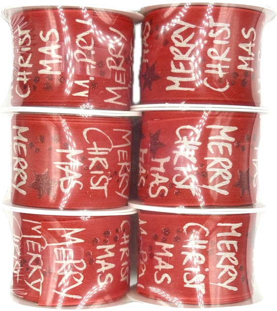 Vánoční látková stuha v sytě červené barvě s jednostranným potiskem „Merry Christmas“ a červeným glitrovým efektem. Okraje jsou zpevněné tkaním a doplněné vetkaným tenkým drátkem, díky čemuž stuha krásně drží tvar a nekroutí se.