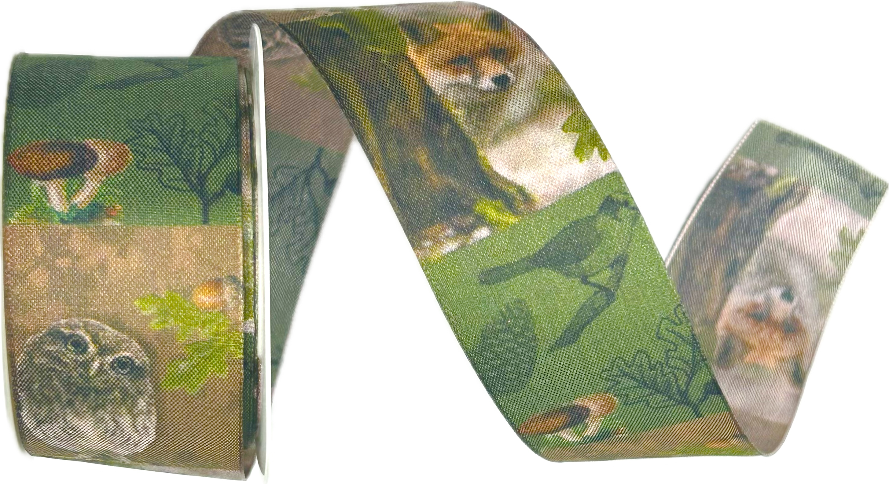 Unikátní dekorační stuha s detailním jednostranným fotopotiskem inspirovaným lesní přírodou. Motiv tvoří realistické obrázky lesních zvířat (lišky, sovy) a přírodních prvků (houby, listy), které vytvářejí harmonickou kompozici v zemitých a zelených tónech.