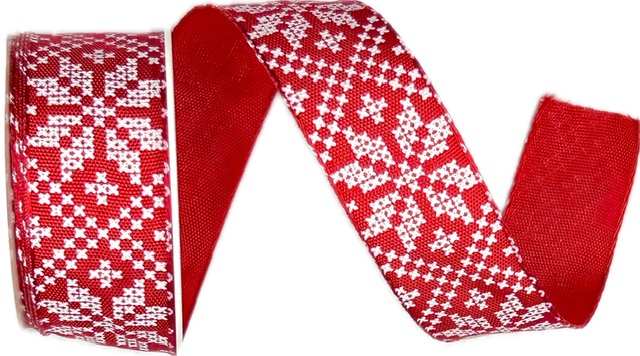 Stylová bavlněná stuha v červeném provedení s jednostranným potiskem ve vzhledu tradiční severské výšivky. Bílý vzor evokuje zimní ornamenty a sněhové vločky – ideální pro rustikální nebo folklórně laděné vánoční dekorace.
