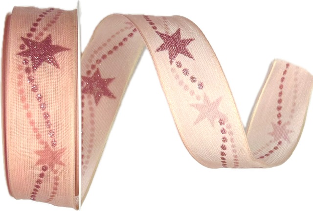 Krásná vánoční látková stuha v růžové barvě s jednostranným potiskem růžových hvězd a zdobných obloučků, doplněná jemným glitrovaným efektem pro slavnostní třpyt. Elegantní a přitom hravý motiv připomíná hvězdnou dráhu – ideální pro vánoční balení a tvoření.