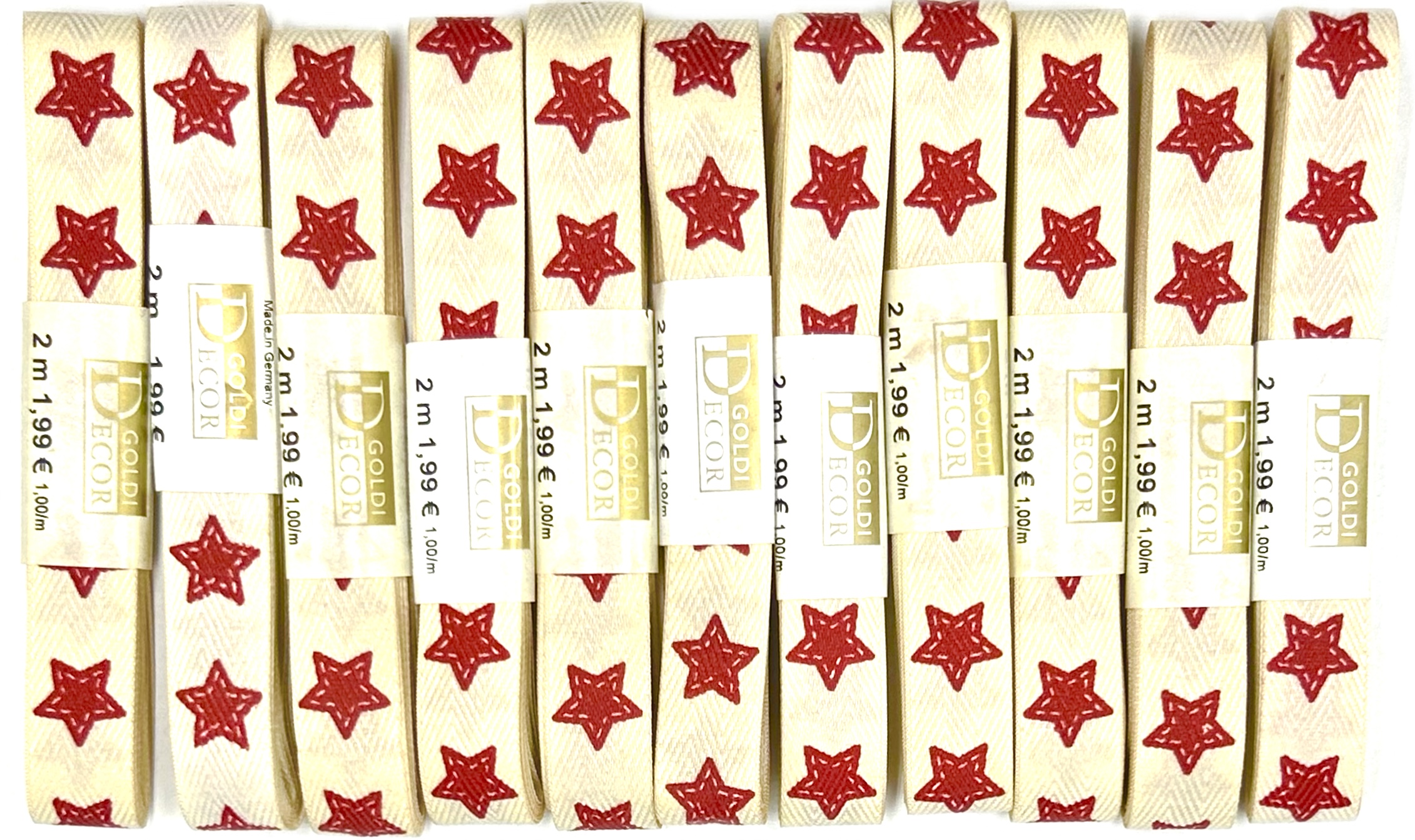 - 10x Stuha vánoční COTTON RIBBON STARS – NATURAL RED béžová 15mm x 2m (8,-Kč/ks)(4,-Kč/m)