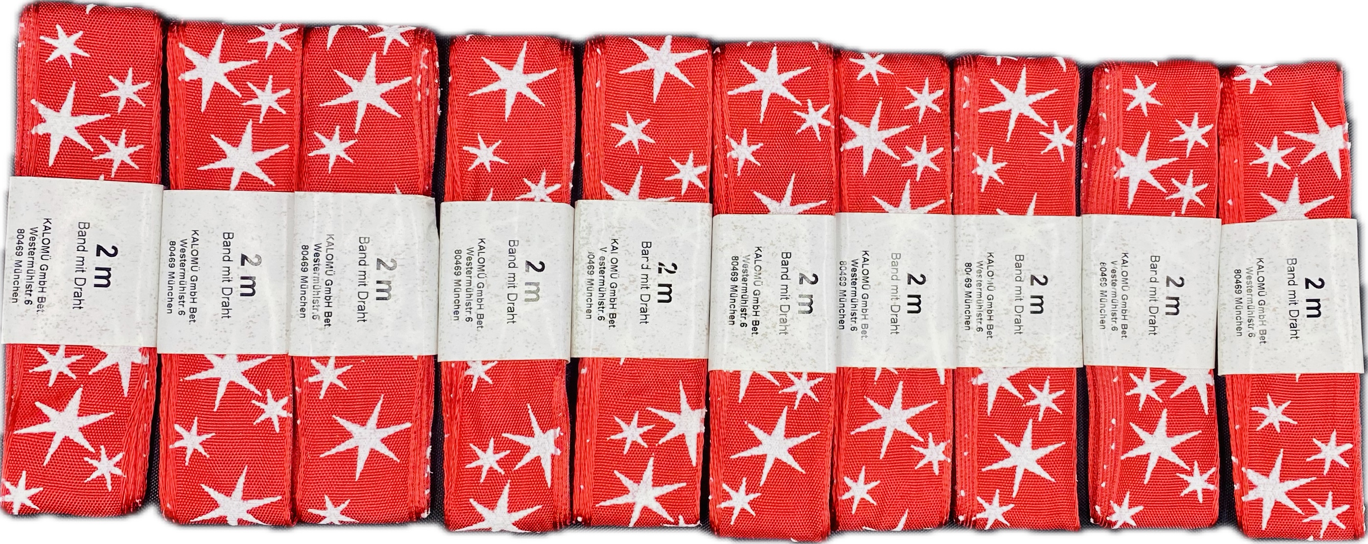 Výhodná sada deseti saténových stuh STARLIGHT RED ve veselém červeném provedení s jednostranným potiskem bílých hvězd je ideální volbou pro bohaté vánoční dekorace i velké dárkové balení. Lesklý satén působí slavnostně, zatímco vetkaný drátek v obou okrajích zajistí perfektní držení tvaru – mašle i dekorace tak budou vždy působit upraveně a elegantně.