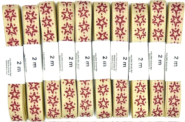 Tuto oblíbenou stuhu nabízíme také ve výhodném balení 10 kusů. Každá role má šířku 15 mm a délku 2 m – dohromady tedy získáte 20 metrů přírodní dekorační stuhy s červenými glitrovými hvězdami.