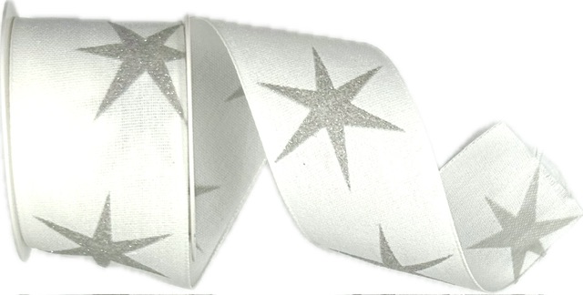 Luxusní bavlněná stuha v elegantní bílé barvě, zdobená výraznými hvězdami se stříbrným glitrovým efektem. Transparentní a oboustranné provedení působí slavnostně a jemně, ideální pro vánoční dekorace i exkluzivní balení dárků.