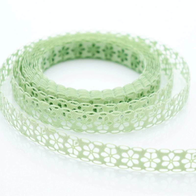 🎀 Floral Lace Pastel Green – vysekávaná dekorativní stuha pastelově zelená 15mm x 1m