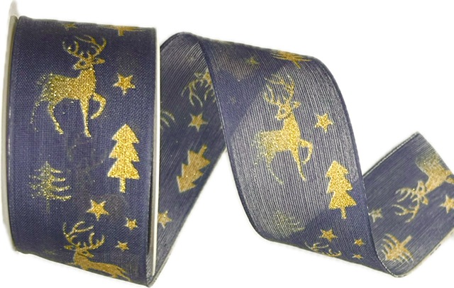 Stuha vánoční WOODLAND REINDEER MIDNIGHT tmavě modrá 40mm x 2m (14,-Kč/m)