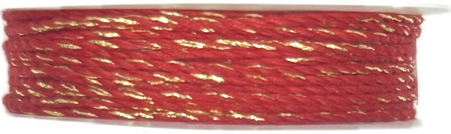 Elegantní dekorační provázek v červeném odstínu, propletený třpytivou zlatou nití. Vyrobený z kvalitní bavlny, má průměr 1 mm a délku 5 m. Díky své jemnosti a decentnímu lesku je ideální pro sváteční i celoroční dekorace.