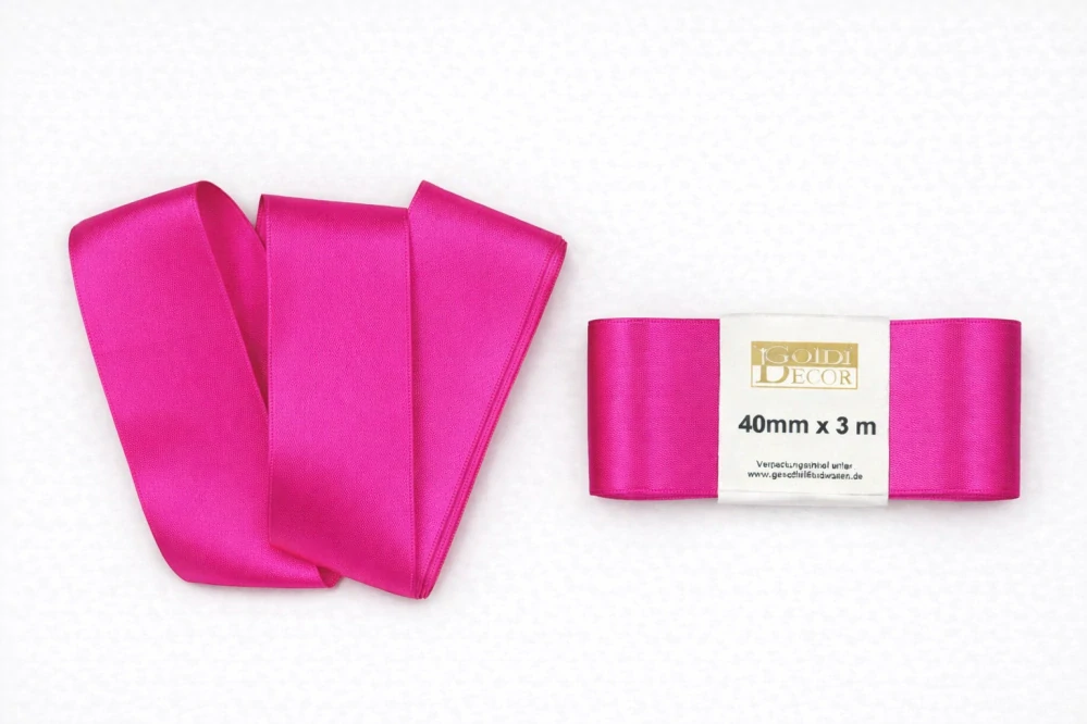 Jednobarevná saténová stuha v sytě růžovém odstínu je výrazná, elegantní a ideální pro kreativní i slavnostní použití. Kvalitní oboustranný satén od německého výrobce má hladký povrch s jemným leskem a dlouhou životnost.