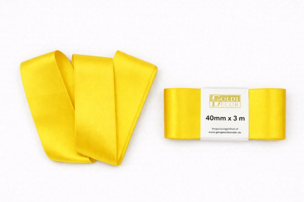šířka: 40 mm délka: 3 m materiál: satén provedení: oboustranný okraje: zesílené tkaním barva: žlutá výrobce: Německo