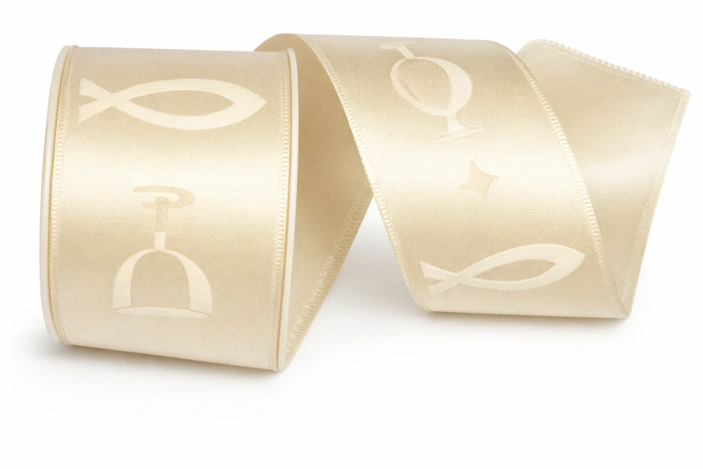 Tato elegantní saténová stuha v krémovém odstínu je zdobena decentním plastickým potiskem s křesťanskými symboly – rybou (Ichthys) a kalichem. Je ideální pro duchovní a liturgické příležitosti, kde podtrhuje význam víry a tradice. Stuha je jemná na dotek, působí slavnostně a vynikne zejména na svátečních aranžmá, dárkovém balení nebo církevních obřadech.