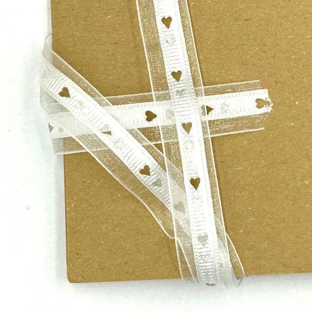 Střed stuhy zdobí dekorativní ražba s vysekávanými srdíčky, která dodává stuze romantický a decentní charakter. Díky tomu je ideální volbou pro svatební výzdobu, vývazky, oznámení i dárkové balení.