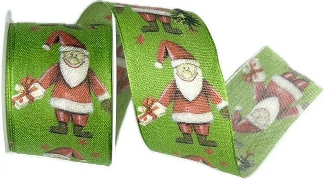 Veselá vánoční stuha z bavlny s jednostranným potiskem usměvavého Santu nesoucího dáreček. Základ tvoří sytě zelené pozadí, které působí svěže a hravě – ideální pro vánoční tvoření a dárkové balení, které má přinést radost.