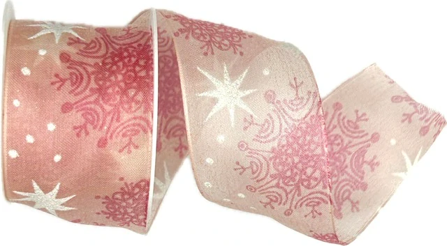 Elegantní organzová stuha v jemně růžové barvě s plastickým bílým potiskem sněhových vloček a hvězd. Průsvitný materiál působí velmi vzdušně a slavnostně, ideální pro zimní a sváteční dekorace.
